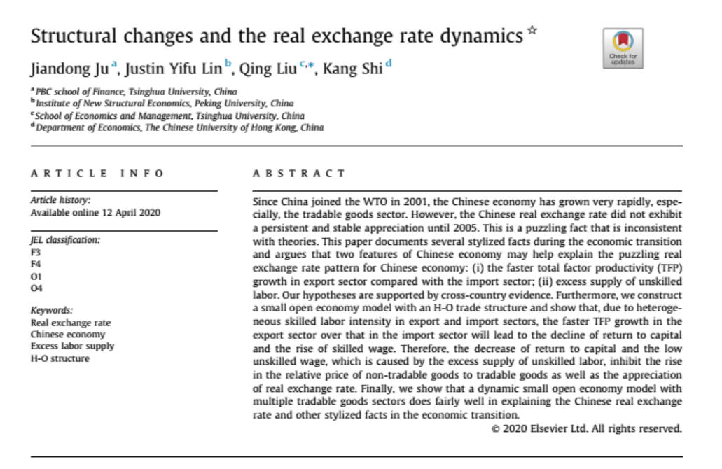 鞠建东、林毅夫等合作者进一步研究了进出口部门全要素生产率增长的差异,以及从农村到城市地区的过剩劳动力供给对实际汇率的影响,并由此建立了两个静态模型。通过对1996年-2013年期间82个经济体系的面板回归分析,得出结论,劳动力市场和可贸易部门的结构性变化对发展中国家的实际汇率动态有很大的贡献。